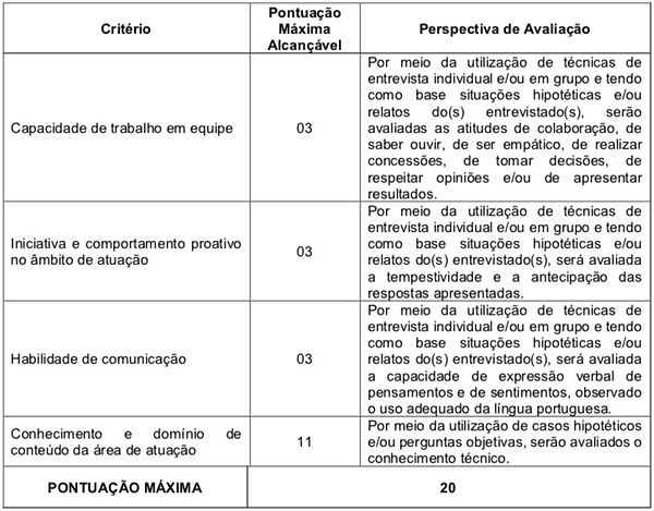 11.1 Ao presente processo seletivo, poderão ser aplicadas as seguintes modalidades de seleção: entrevista técnico- comportamental ou entrevista comportamental . Abaixo o quadro dos critérios que serão avaliados na entrevista: